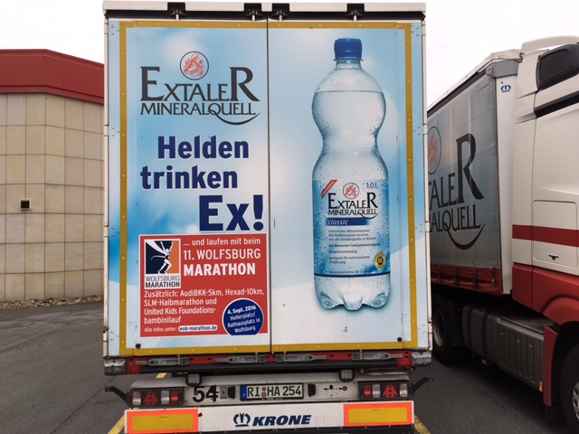 Auf einer großen Zahl von Fahrzeugen unserer LKW-Flotte prangt das Marathonlogo. Darüber hinaus befinden sich auch mehrere Millionen Flaschen mit der Veranstaltungswerbung im Handel.